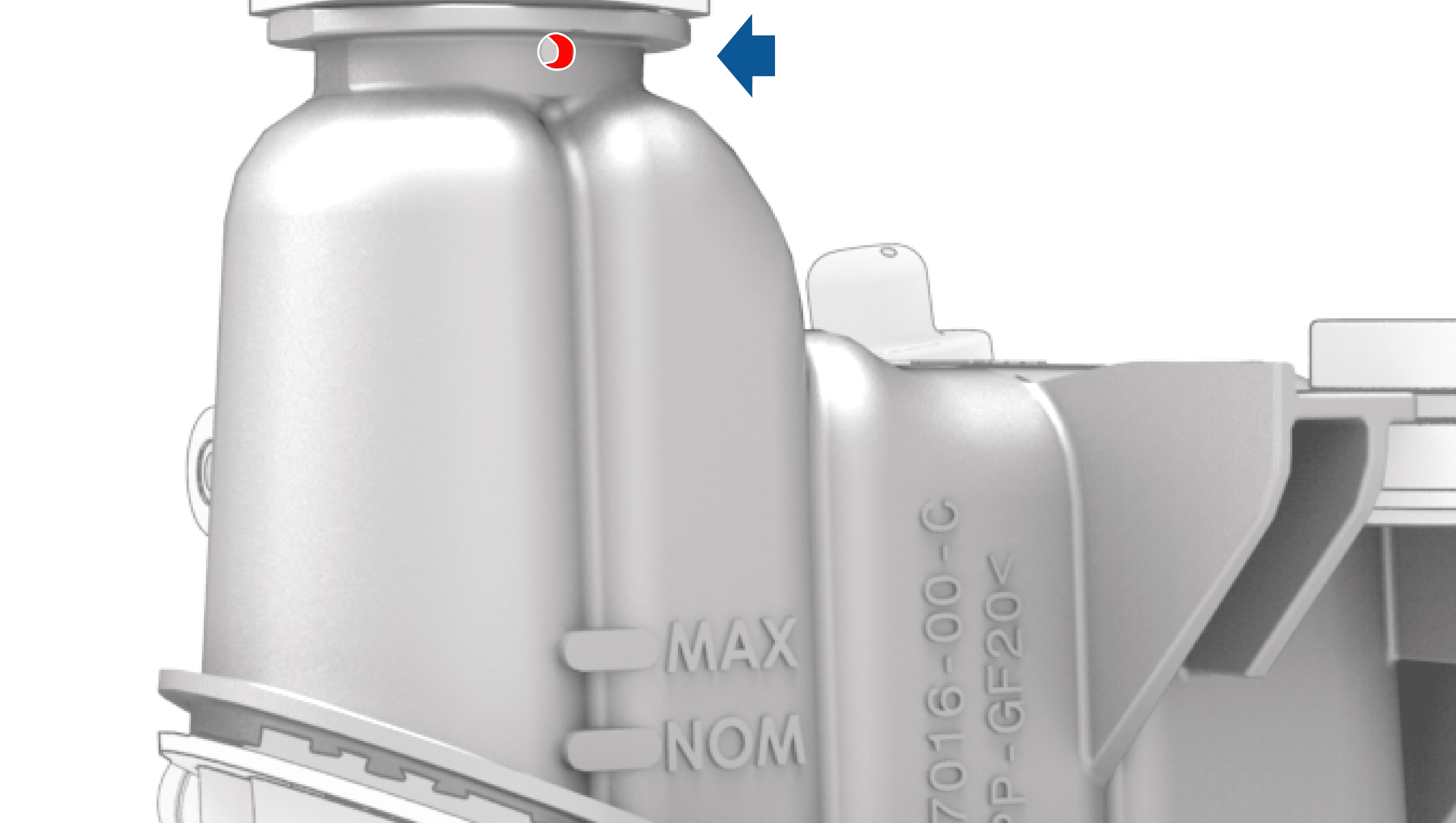 - 为超级瓶添加冷却液,使得液位高出 MAX 线约 6 毫米(0.25 英寸),然后装上超级瓶的盖子。
