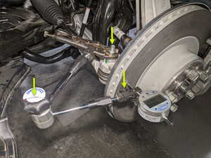 - 将制动盘偏转挠性杆安装到前横拉杆螺母上并设置用于读取。