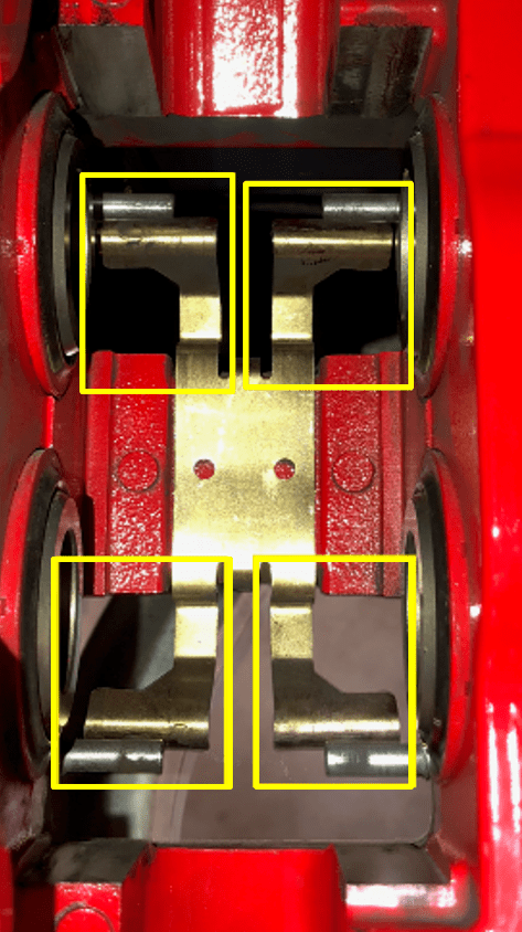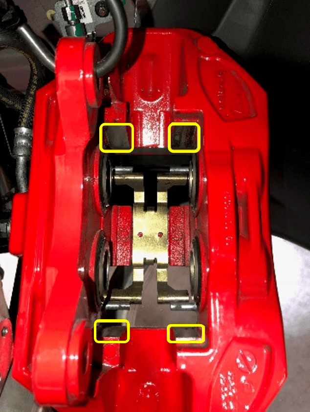 使用刷子和 Tesla 批准的制动器清洁剂清洁相接平面、活塞表面、左前制动钳内表面、定位销、减振弹簧、制动片边缘以及与制动钳接触的表面。