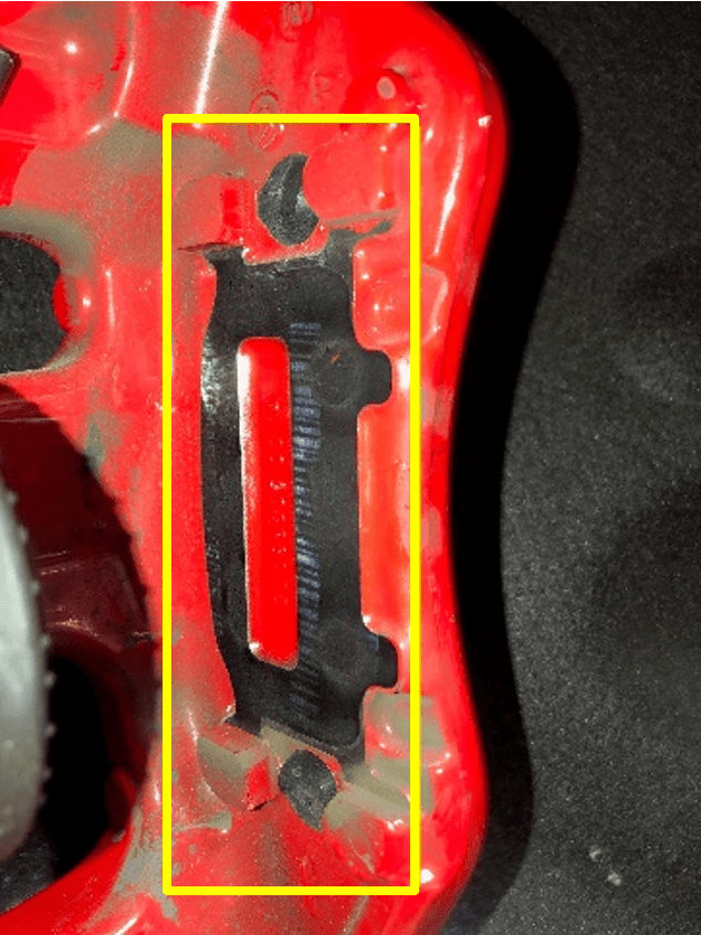 使用刷子和 Tesla 批准的制动器清洁剂清洁相接平面、活塞表面、左后制动钳和左后支架的内表面、减振弹簧、相接面弹簧/卡子、制动片边缘以及与制动钳或支架接触的表面。