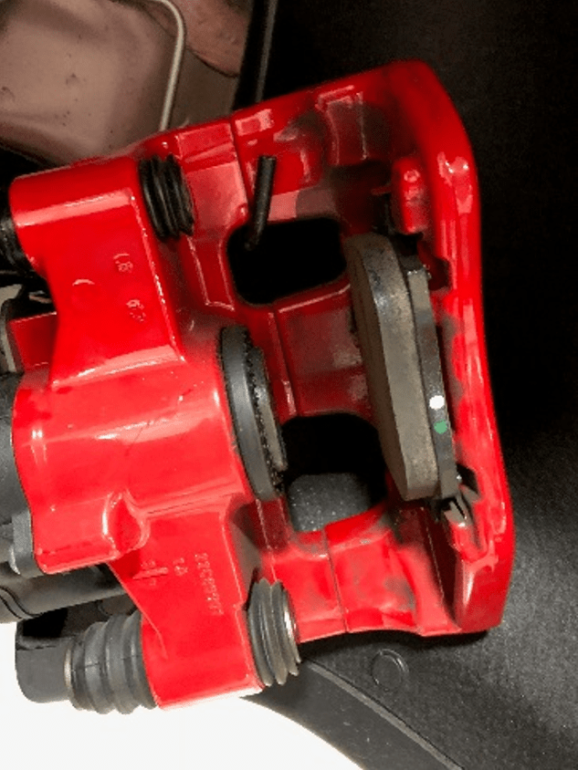 - 松开红色固定锁片,断开电气线束与左后制动钳连接器的连接。