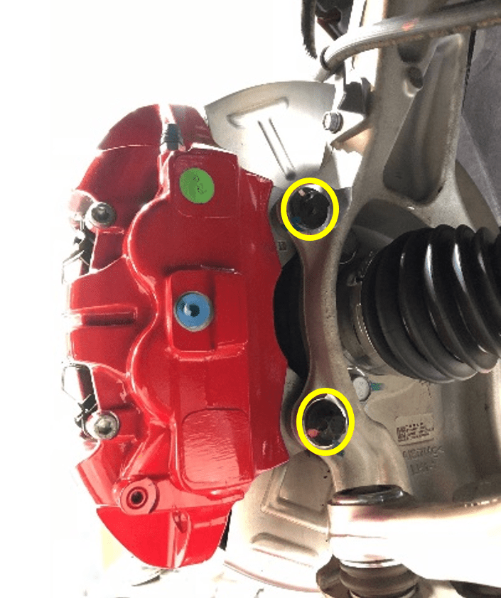 将左后制动钳安装到左后支架上,安装将制动钳固定到支架的下部螺栓,然后用油性记号笔标记螺栓头。