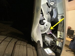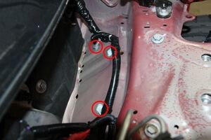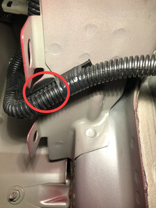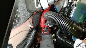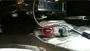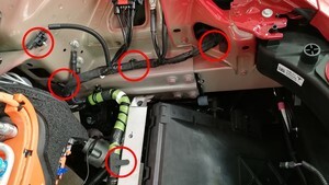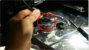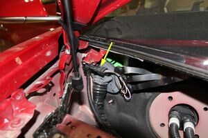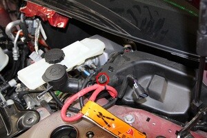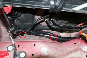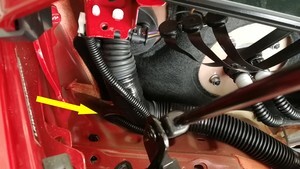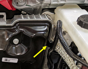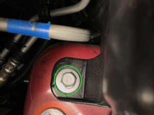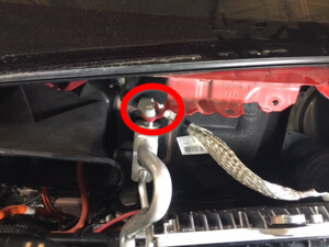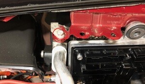 - Remove the nut that attaches the 12V battery rear hook tie down.