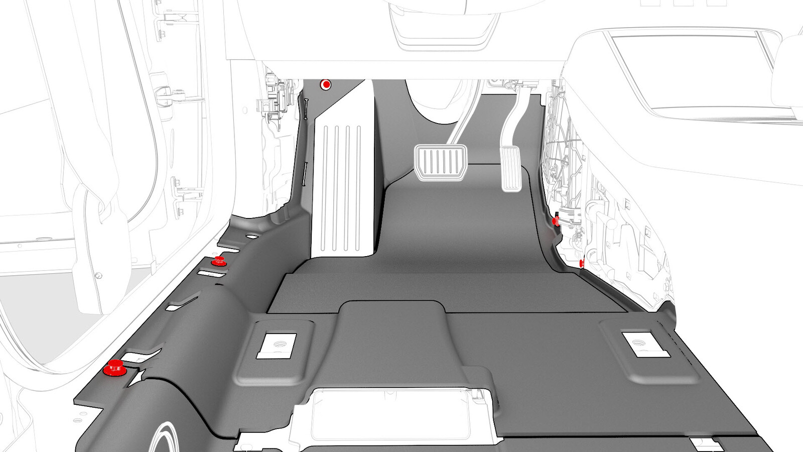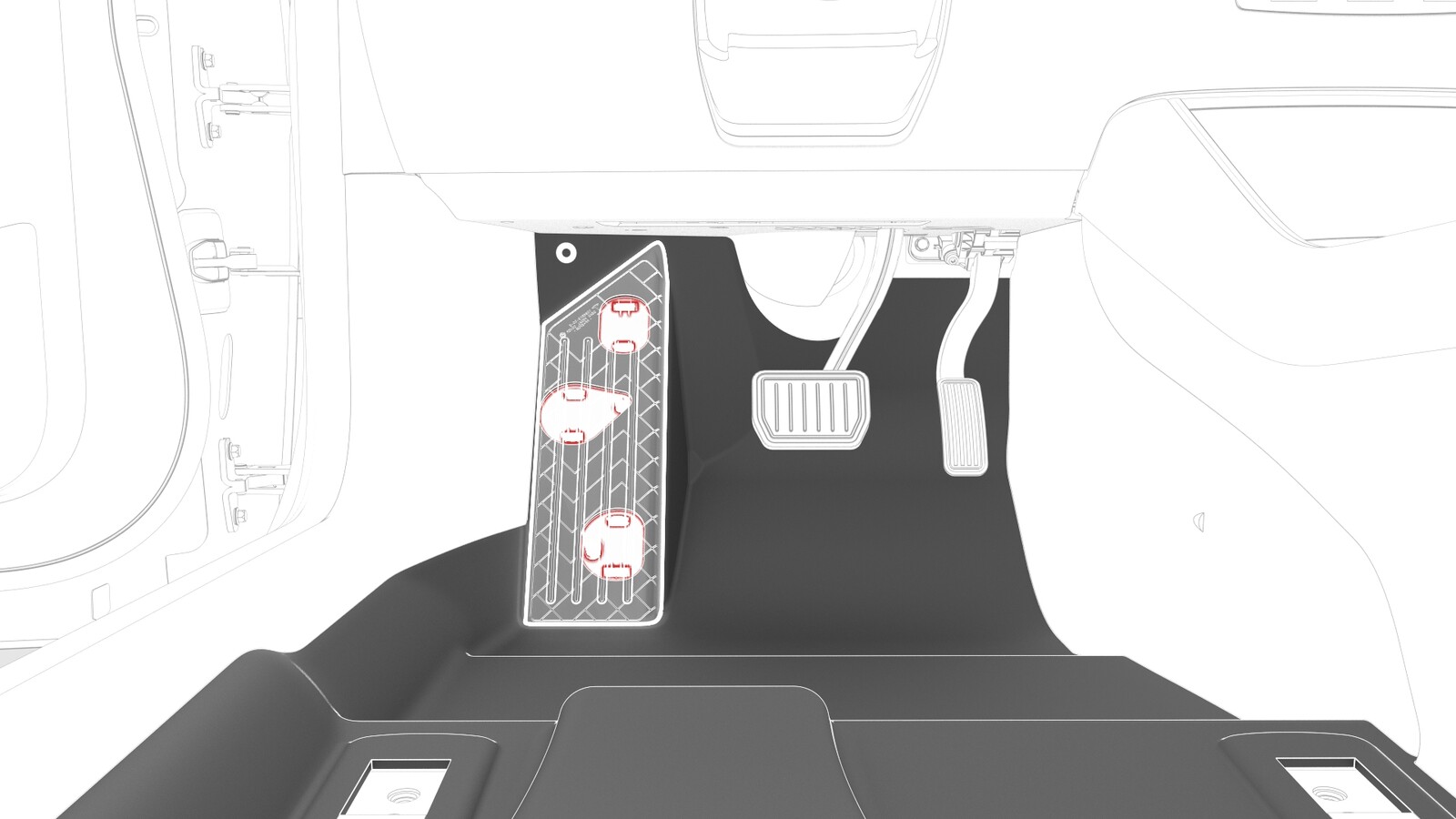 - 松开将驾驶位脚踏固定到车身的夹子,然后从车上拆下 LH 前毡毯。