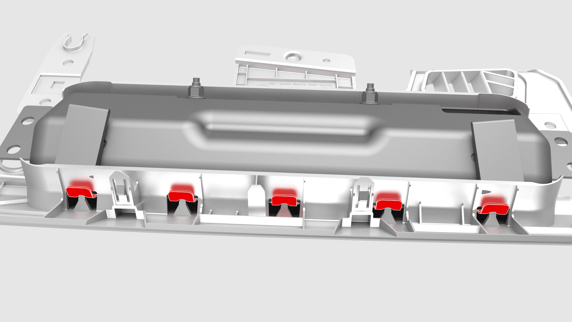- 分开将前排乘客膝部气囊固定到密封饰板的锁片 (x11),然后从饰板上拆下该气囊。