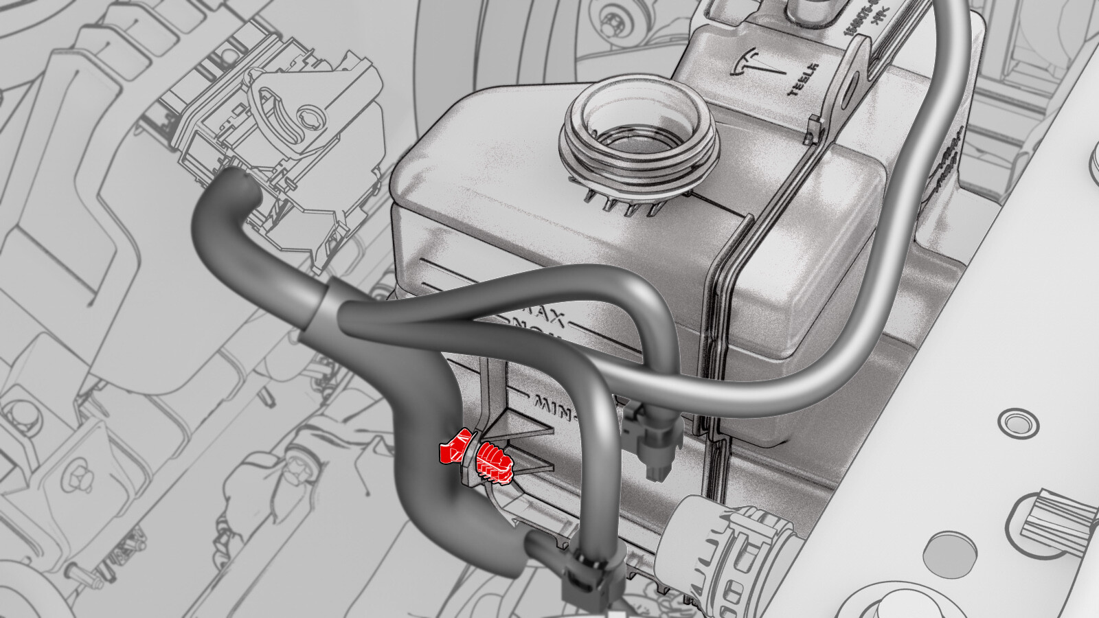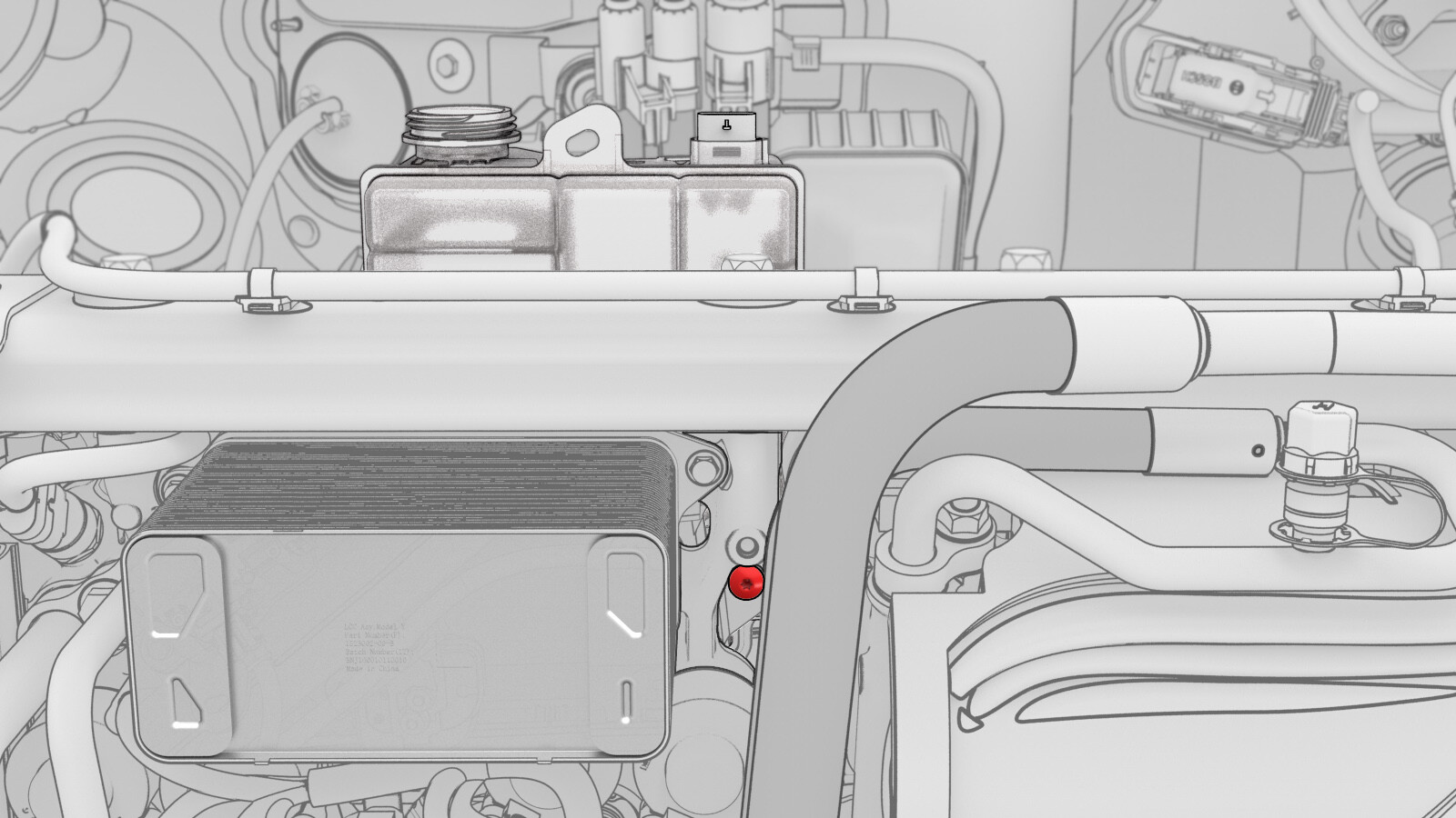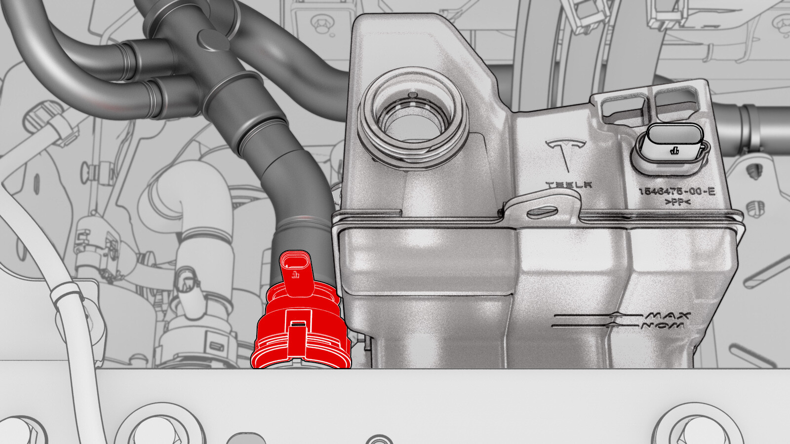 将冷却液罐附近电气连接器与冷却器至电池软管传感器相连。