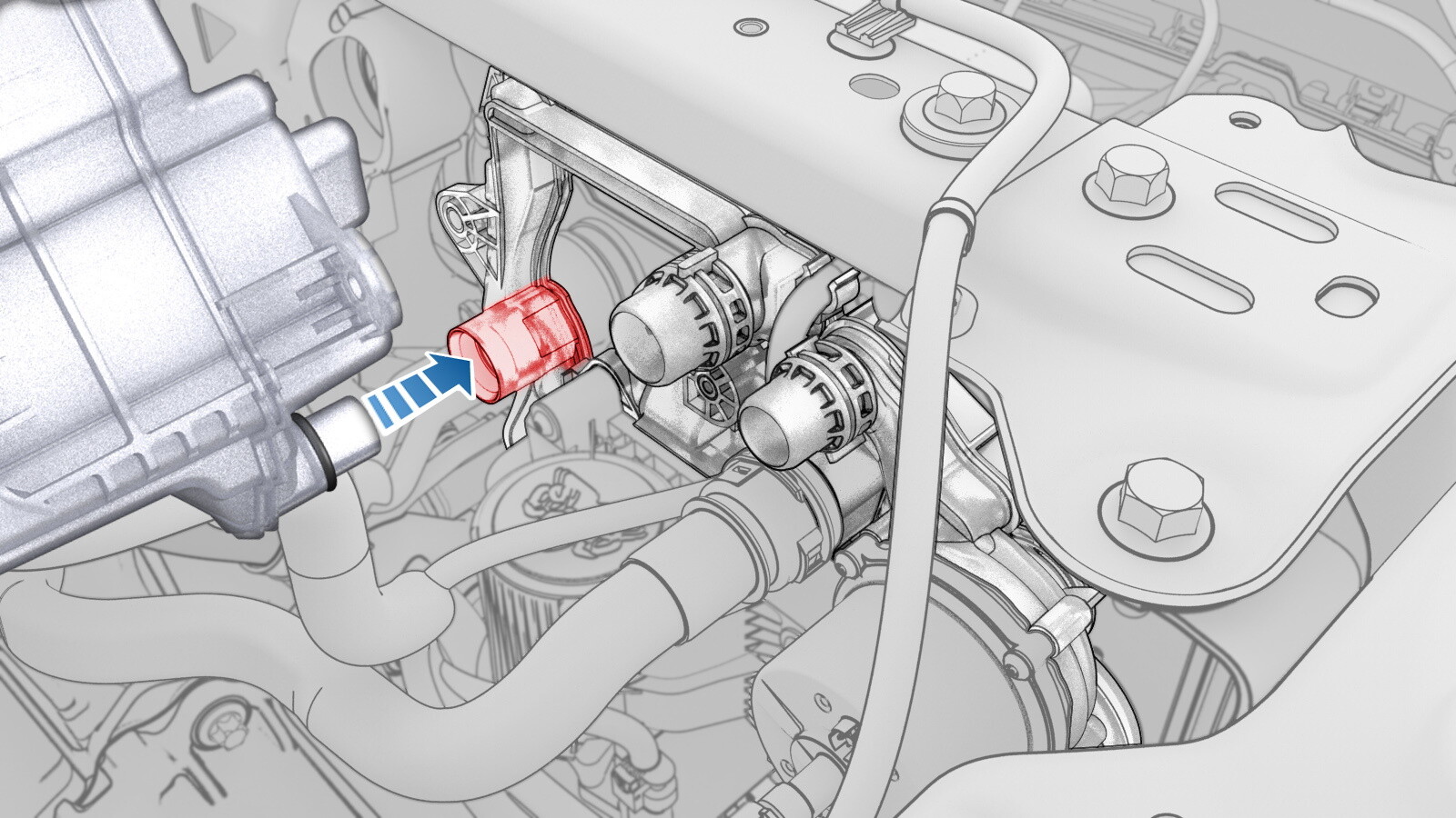 在冷却液罐附近,将电气连接器连接到动力总成供给软管传感器。