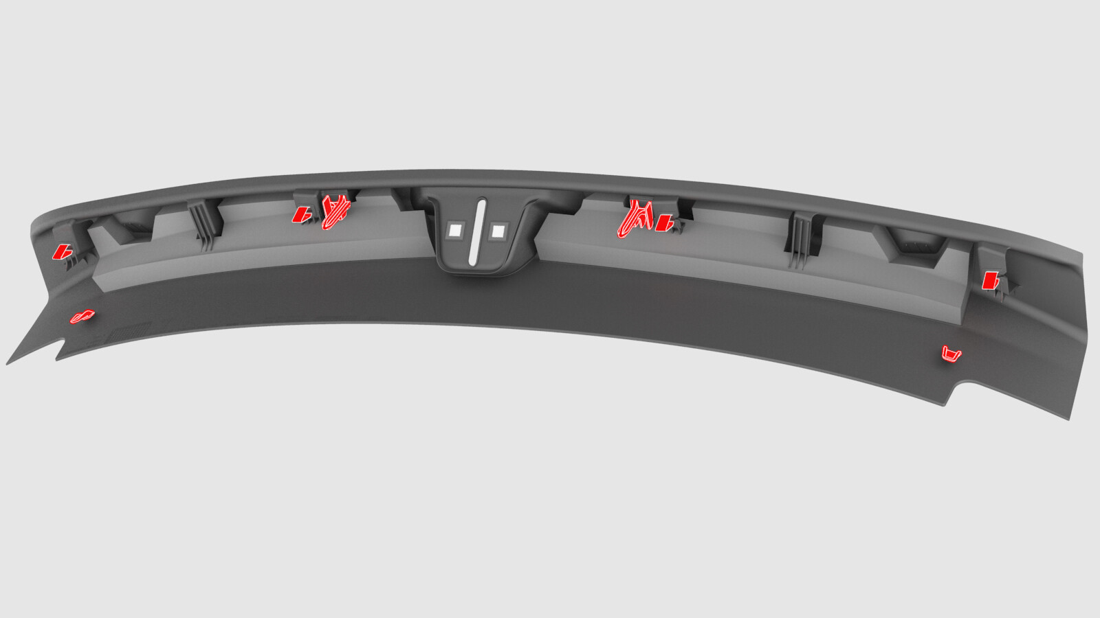 将后备箱闩锁与后备箱门槛饰板凹槽对齐,将长锁片(2 个)与后备箱盖上的凹槽对齐,然后下压饰板,以便固定锁片和所有剩余卡子。