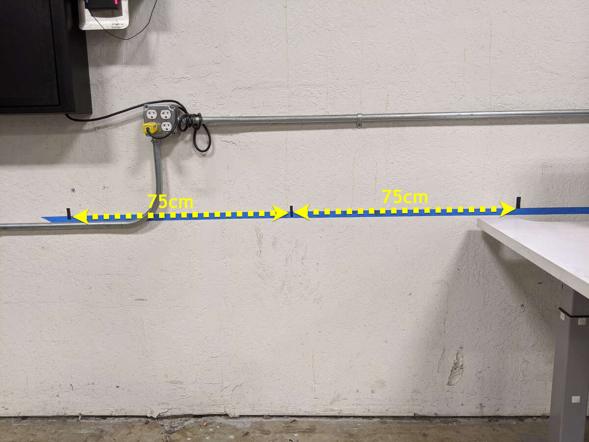 - 在距离中心参考点左右两侧75 厘米(29.5 英寸)处的墙壁上粘贴胶带。这两处为左右两侧的参考点。