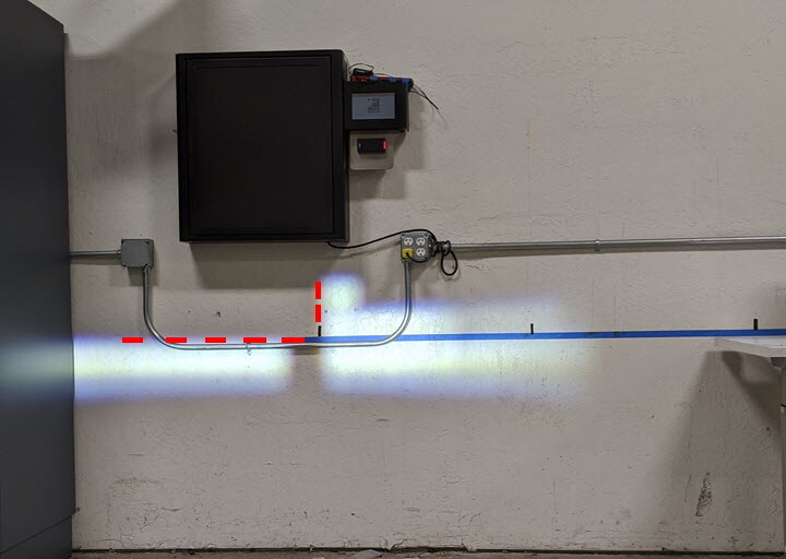 手持激光笔对准墙壁上的胶带,向车辆中心点投射一束激光束。激光束与车辆中心对齐后,在第4步中粘贴的胶带旁,使用胶带在墙壁上标记激光笔的位置。此处为中心参考点。