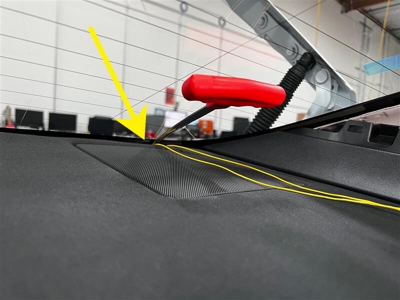 将电线固定在穿线器上,然后将穿线器从车辆内部穿过背光灯玻璃底部区域的粘合剂涂层。