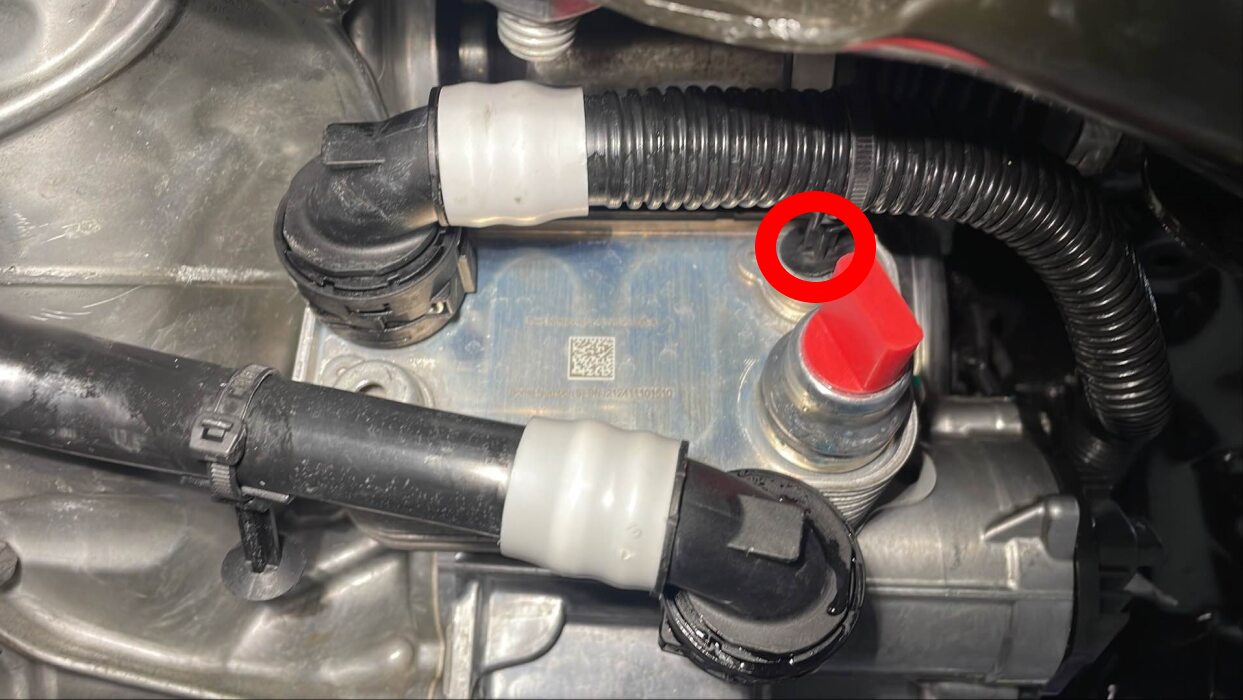 - Fasten the clip that attaches the rear drive unit outlet hose to the rear drive unit heat exchanger.