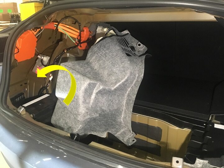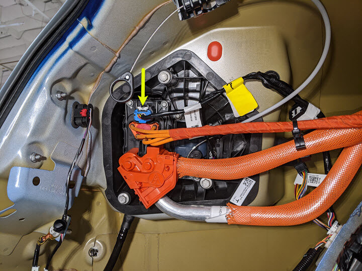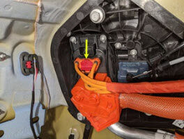 注Make sure to wear PPE (HV gloves, safety glasses) when working on high voltage component, Be sure to place the positive test lead on the side of the HV pin just past the plastic protective covers Measure the the voltage between B+ (the four dead front pins) to B- (rear left door striker as a ground for the isolation check), If voltage is greater than 10V, pack contactors are not open or welded, Stop work and reach out to Service Engineering.