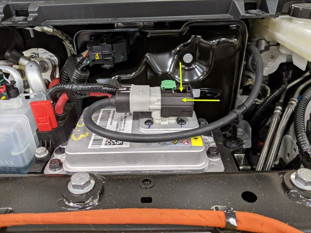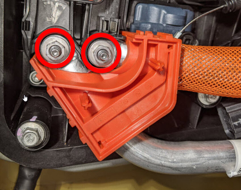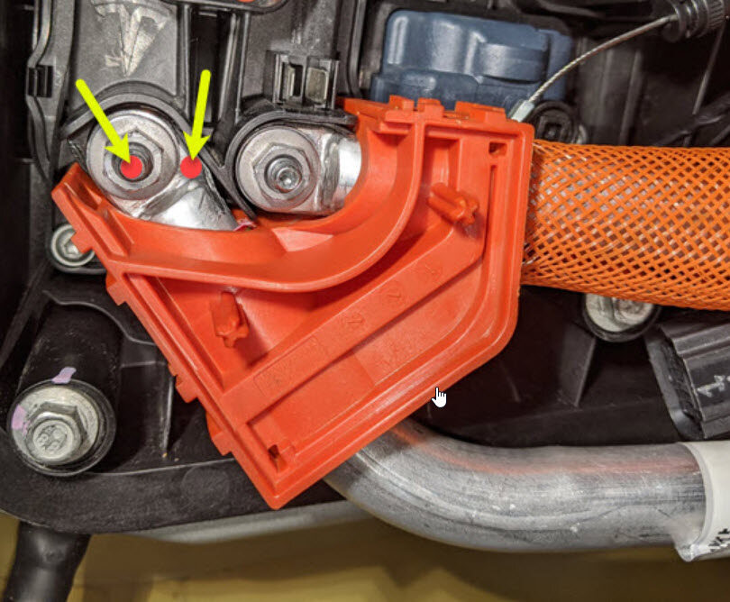 注Make sure to wear PPE (HV gloves, safety glasses) when working on high voltage component, Be sure to place the positive test lead on the side of the HV pin just past the plastic protective covers Measure the voltage between B+ (the two dead front pins) to B- (rear left door striker as a ground for the isolation check), If voltage is greater than 10V, pack contactors are not open or welded, Stop work and reach out to Service Engineering.
