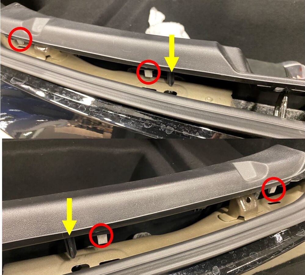 注6x clips, Number of clips may vary on newer vehicles, Verify trunk seal is fully seated along garnish