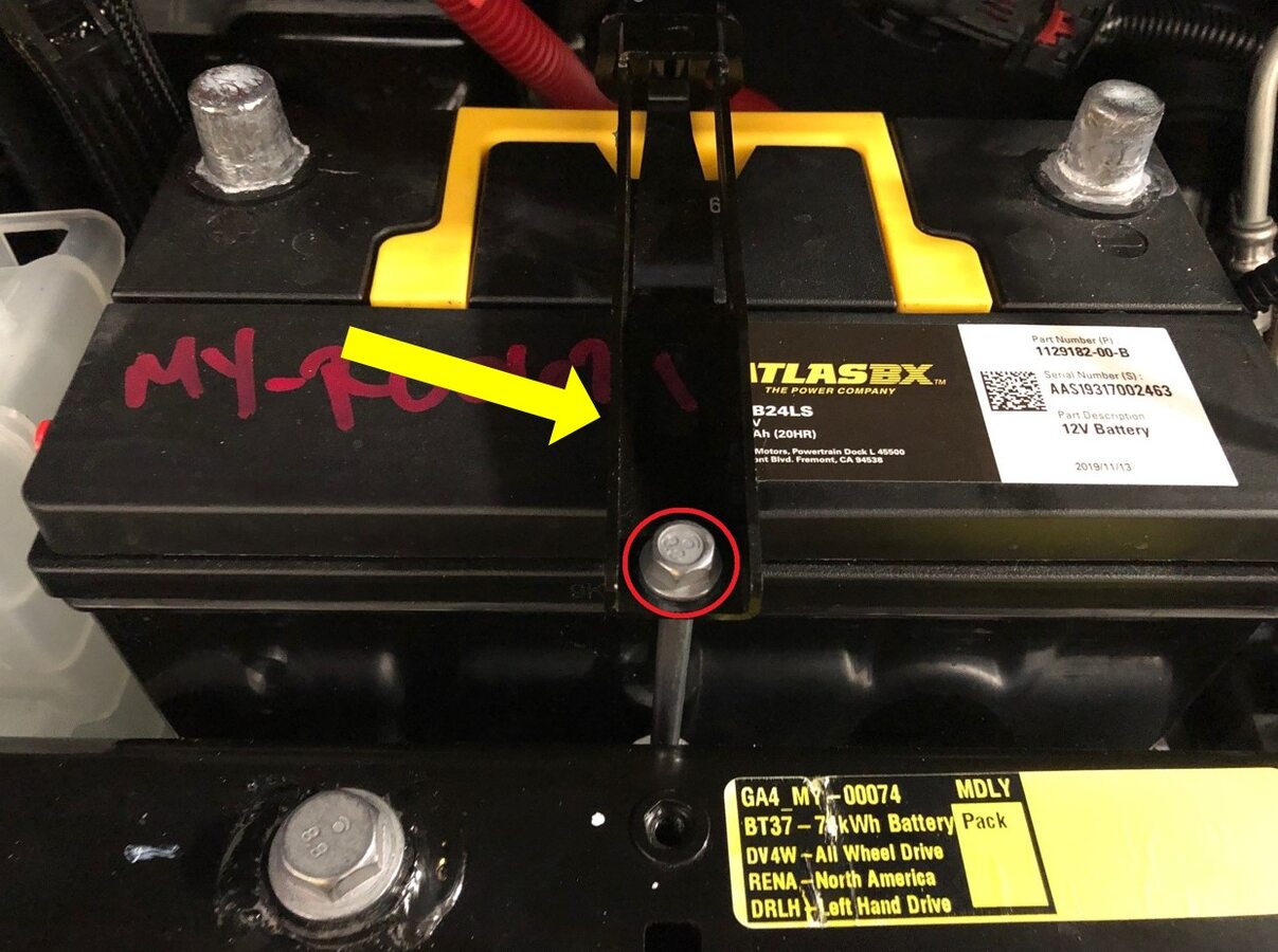 注1x bolt, 10mm, 5 Nm, Lift battery tie down strap up and remove it from rear tie down hook strap