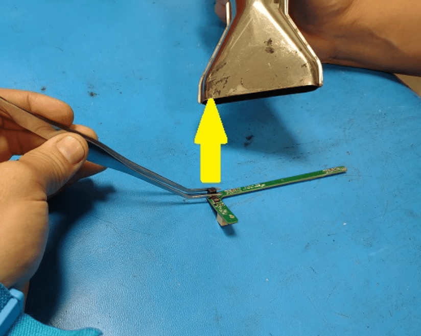 如图所示,使用热风枪在挡风玻璃外侧释放粘合剂的热量,然后在加热时轻轻地将板撬离支架,将传感器从支架上拆下。