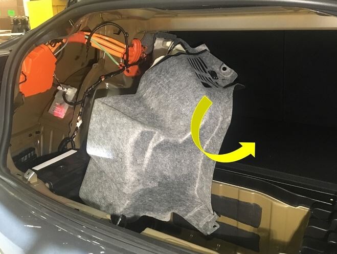 从行李箱毡毯上松开行李箱 LH 侧饰板,将饰板向后拉以便操作充电接口电子控制单元,然后将毡毯塞入饰板下方。
