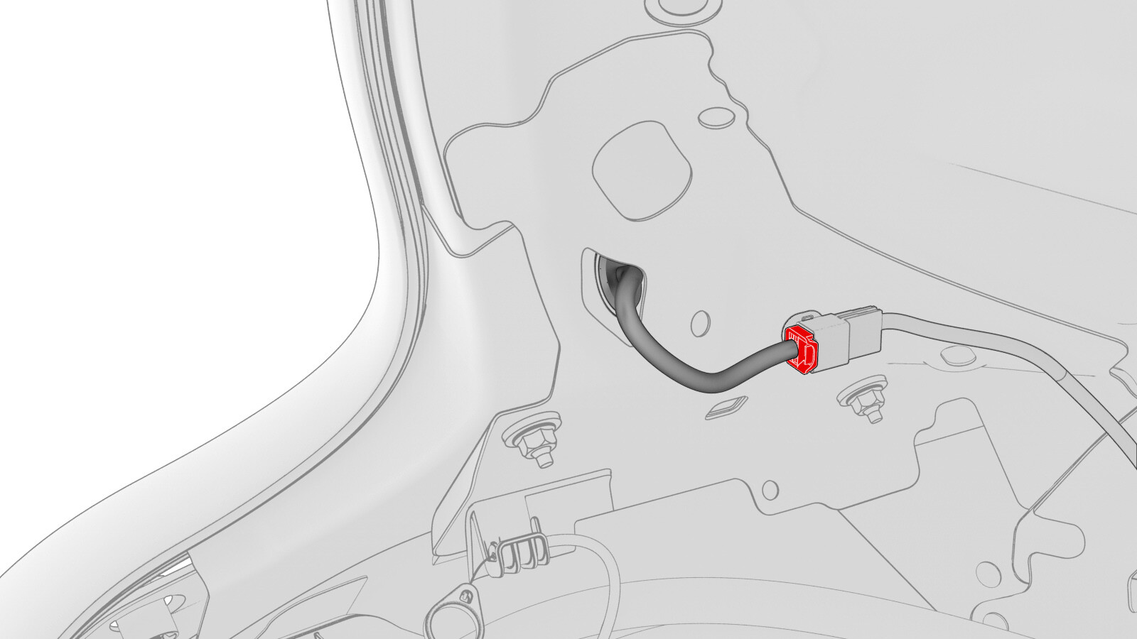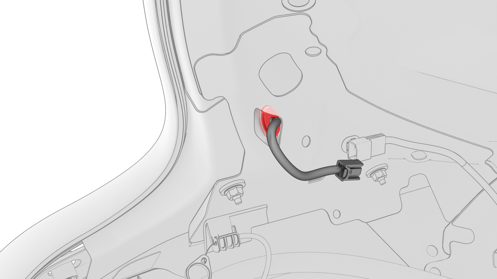 - 在车辆内部 LH 侧拆下行李箱饰板的位置附近,断开电气线束与行李箱电动支杆电气连接器的连接。
