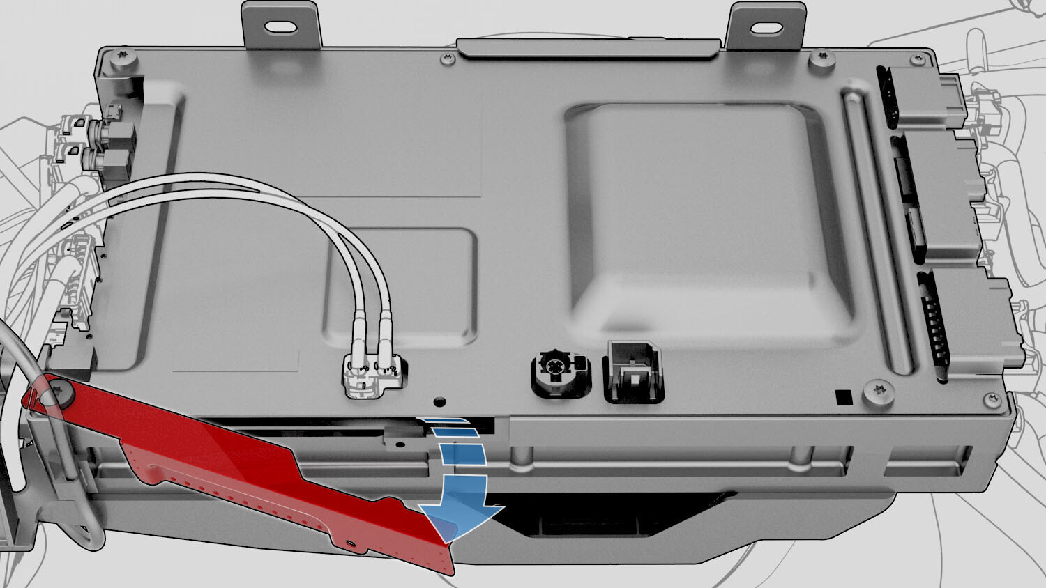 - 使用镜子和镊子将锁键移至右侧,然后将 SIM 卡与车载电脑中的卡槽分离。