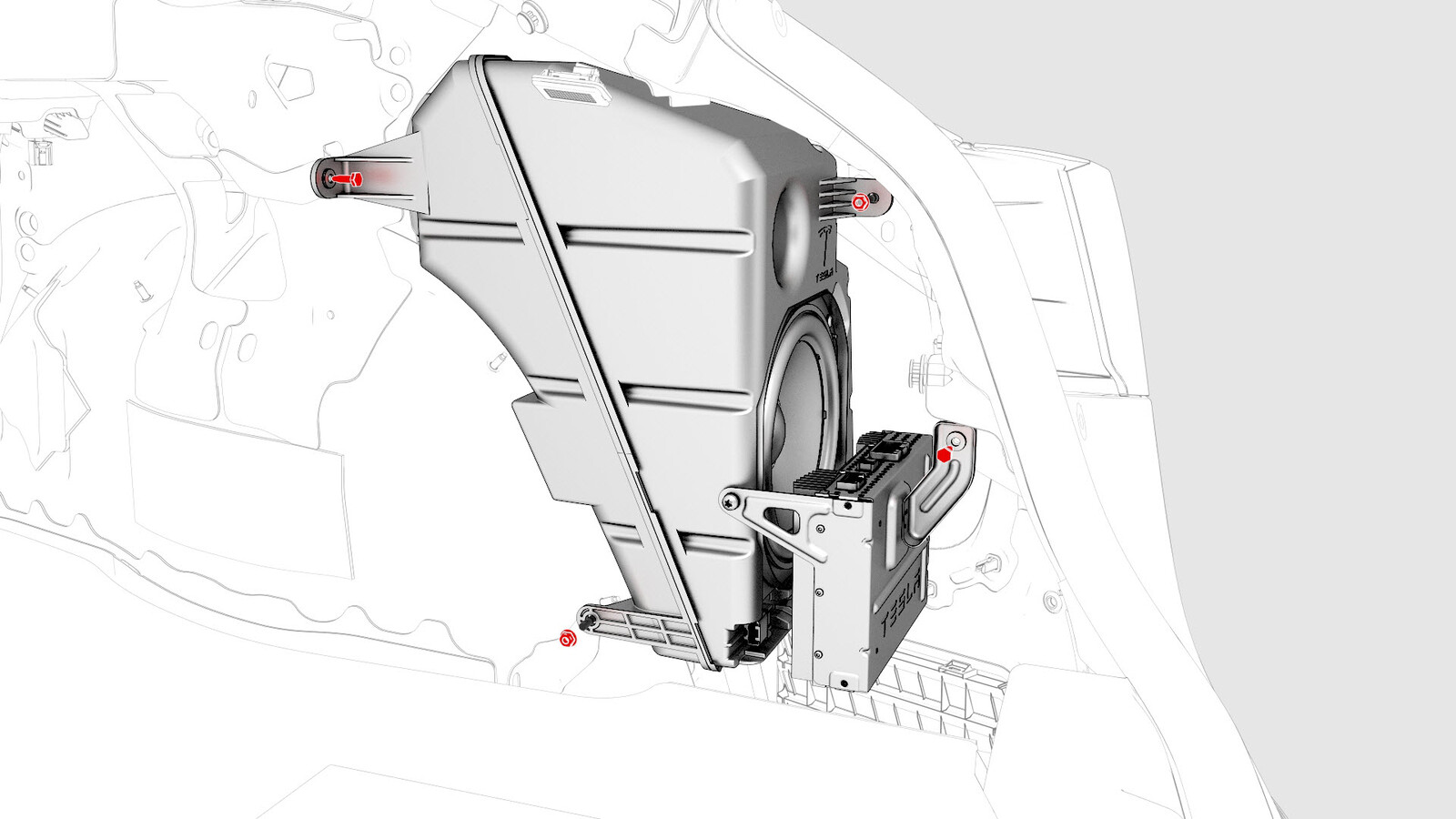 拆下将重低音扬声器固定到车身的螺栓和螺母,然后从车上拆下重低音扬声器。