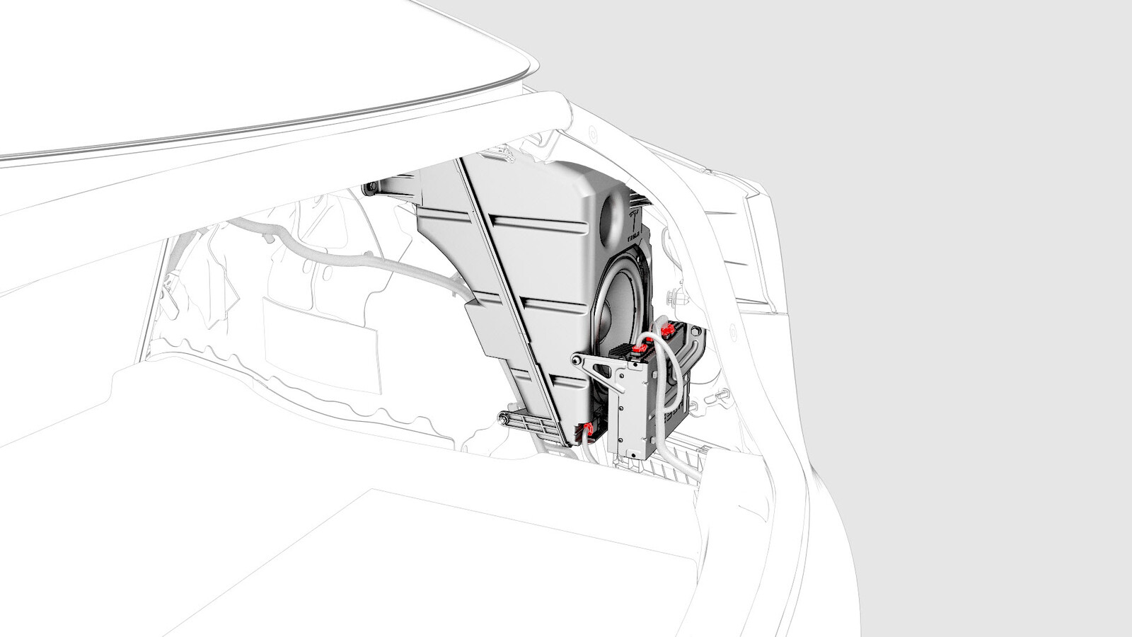 - 松开将电气线束固定到重低音扬声器的夹子。