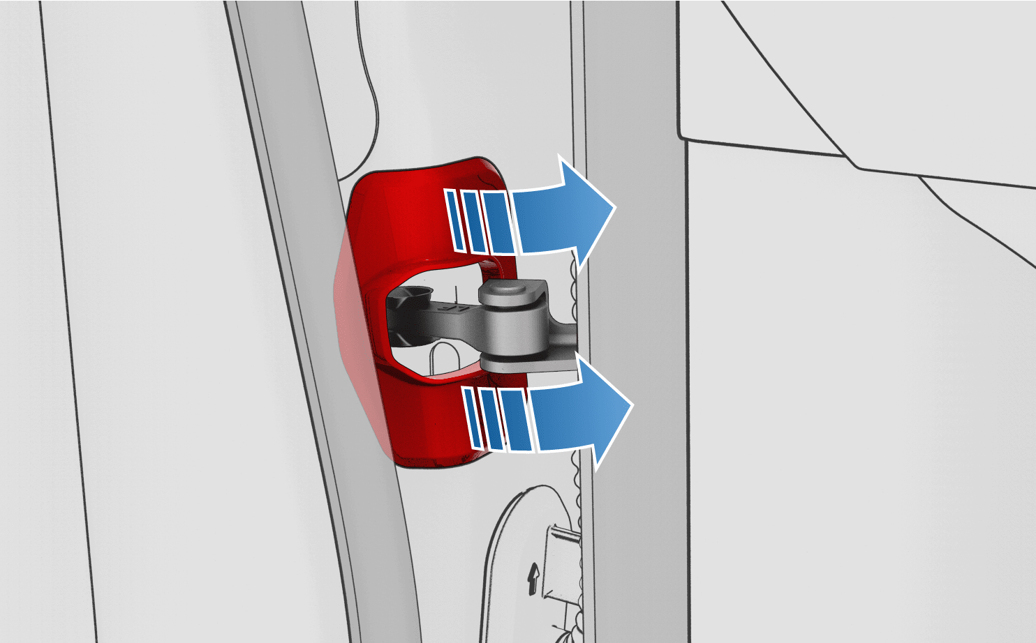 警告拧松车门限位器的螺栓,让车门能在开启极限范围以外自由摇动。 - 使用塑料饰板工具松开将限位器密封条固定到车门的夹子 (x3)。