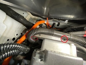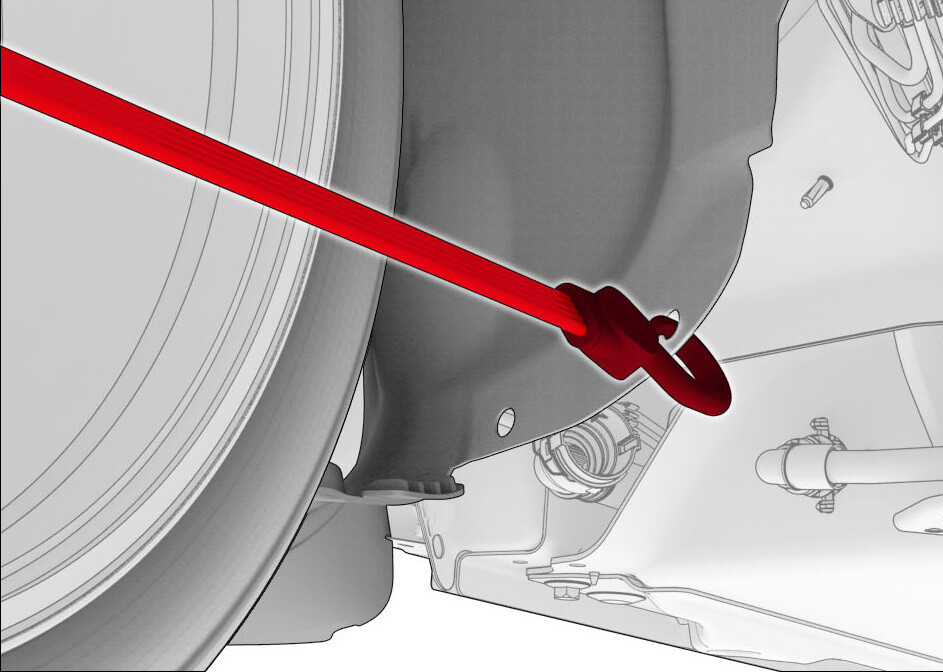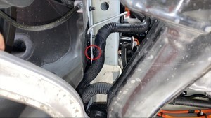 - Install a bungee strap to pull the RH front wheel arch liner away from the HV battery and expose the coolant hoses.