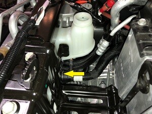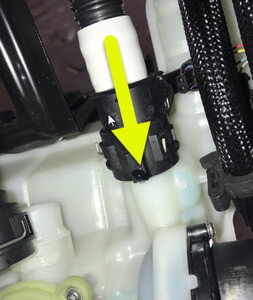 - Release the clips (x2) that attach the Superbottle to powertrain coolant supply hose to the battery beam.