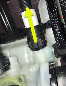 - Remove the plugs from both fittings, immediately connect the Superbottle to powertrain coolant supply hose to the rear powertrain supply hose, fasten the clip, and perform a Push-Pull-Push test of the connection.