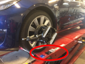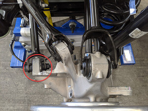作为辅助检查,测量围板底部到轴中心的距离,以确保左悬架已设置到行驶高度