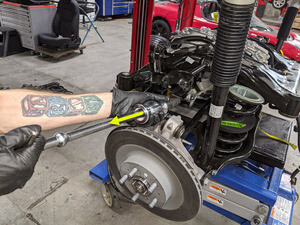 注2 个螺栓,15 毫米,41 Nm;在减震器顶部施加压力,向下推动以从轮毂内衬上脱离