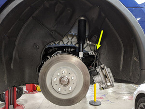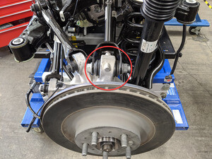 将左后制动钳从左后转向节上拆下,然后将其悬挂在车身上