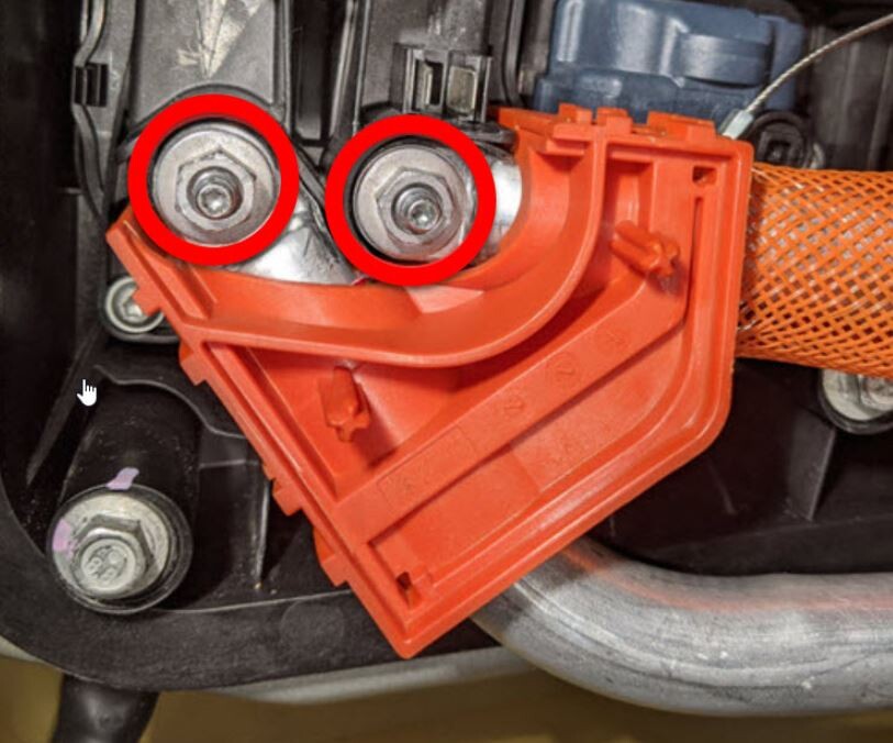 拆卸将充电接口母排固定到高压接头的螺栓(2 个)。