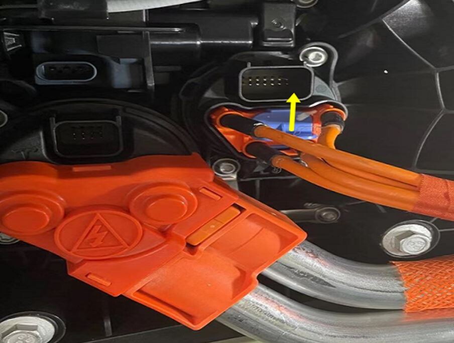 拆卸用于封闭高压电池仓高压接头处充电接口母排检修盖板的螺栓,然后打开检修盖板。