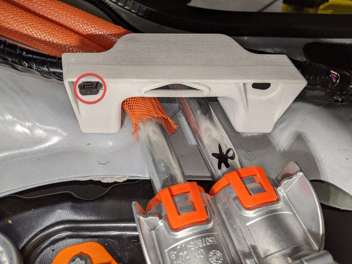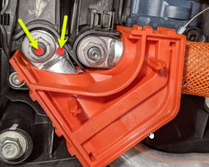 在充电接口处,使用 Hioki 电阻计测量充电接口母排引线与充电接口母排螺柱之间的电阻。另请对其他引线和螺柱执行该测试。