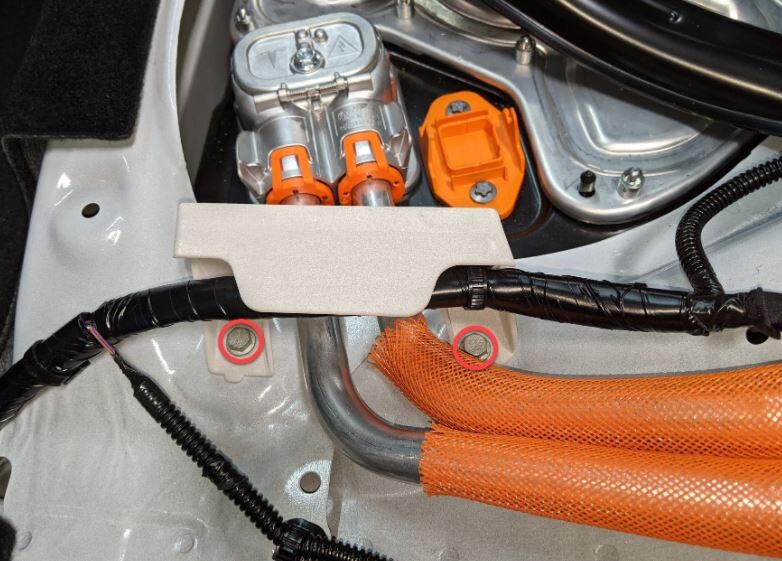 在高压电池仓处,使用 Hioki 电阻计测量充电接口母排引线与高压电池仓高压接头螺栓头之间的电阻。另请对其他引线和螺栓头执行该测试。