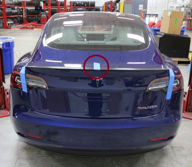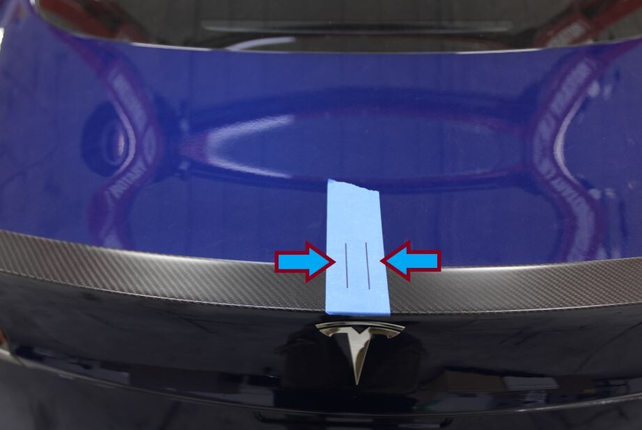 - 将后扰流板遮蔽胶带上的两个标记与行李箱盖遮蔽胶带上的两个标记对齐。让后扰流板的边角远离行李箱盖,以便先安装后扰流板的中间部分。