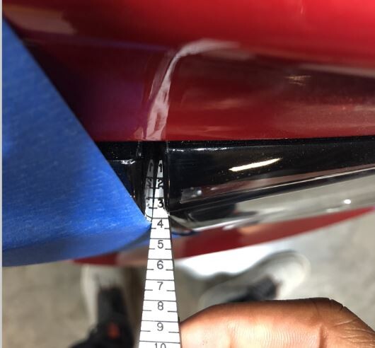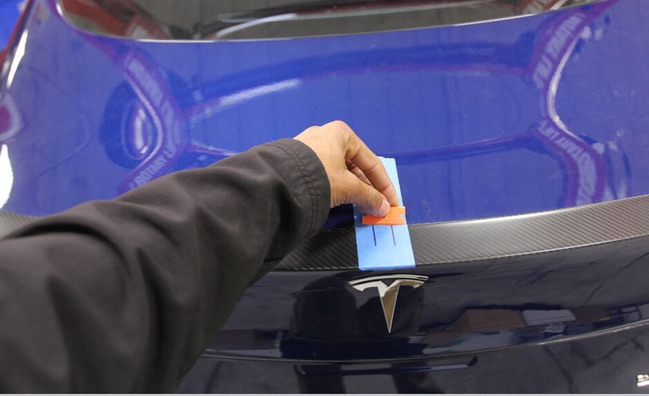 - 给后扰流板的中心贴上遮蔽胶带。留下多余的遮蔽胶带,以便在此程序的后续步骤用于行李箱盖。