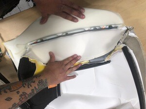- 将座垫饰板放置到泡沫垫上,然后重新安装将座垫饰板固定到泡沫垫的夹子 (x18) 或 Velcro。
