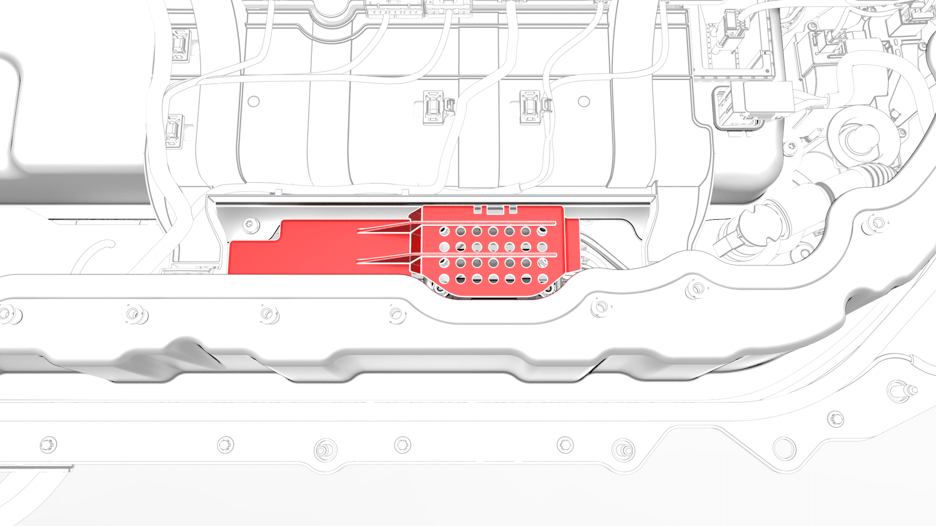 - 将保险丝检修口绝缘体安装到右侧高压电池仓母排盖板上,紧固将绝缘体固定到盖板的卡子,然后降低高压控制器。