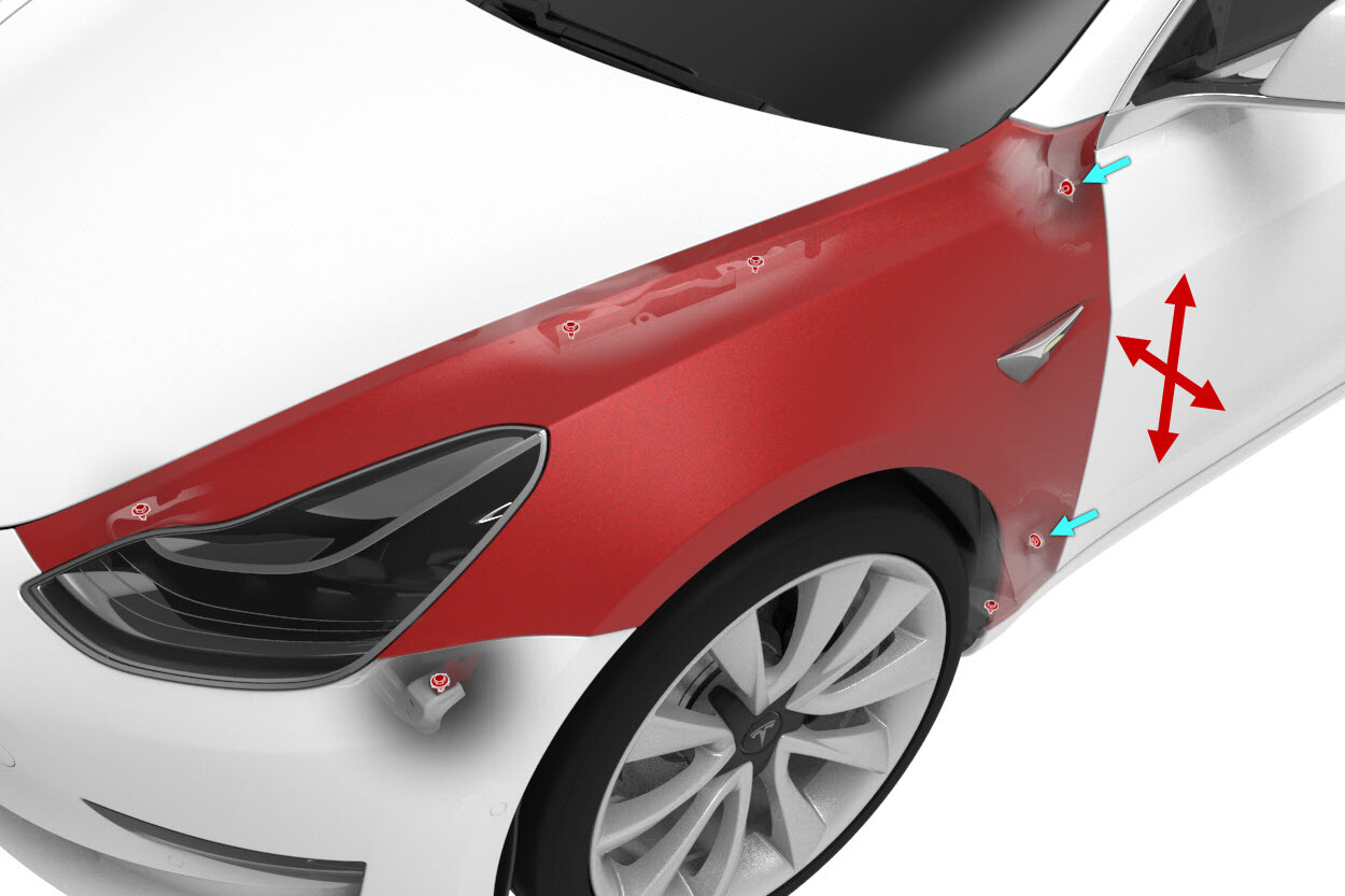 - 参考图片,确定需要松开哪些硬件才能朝所需方向调整翼子板位置。