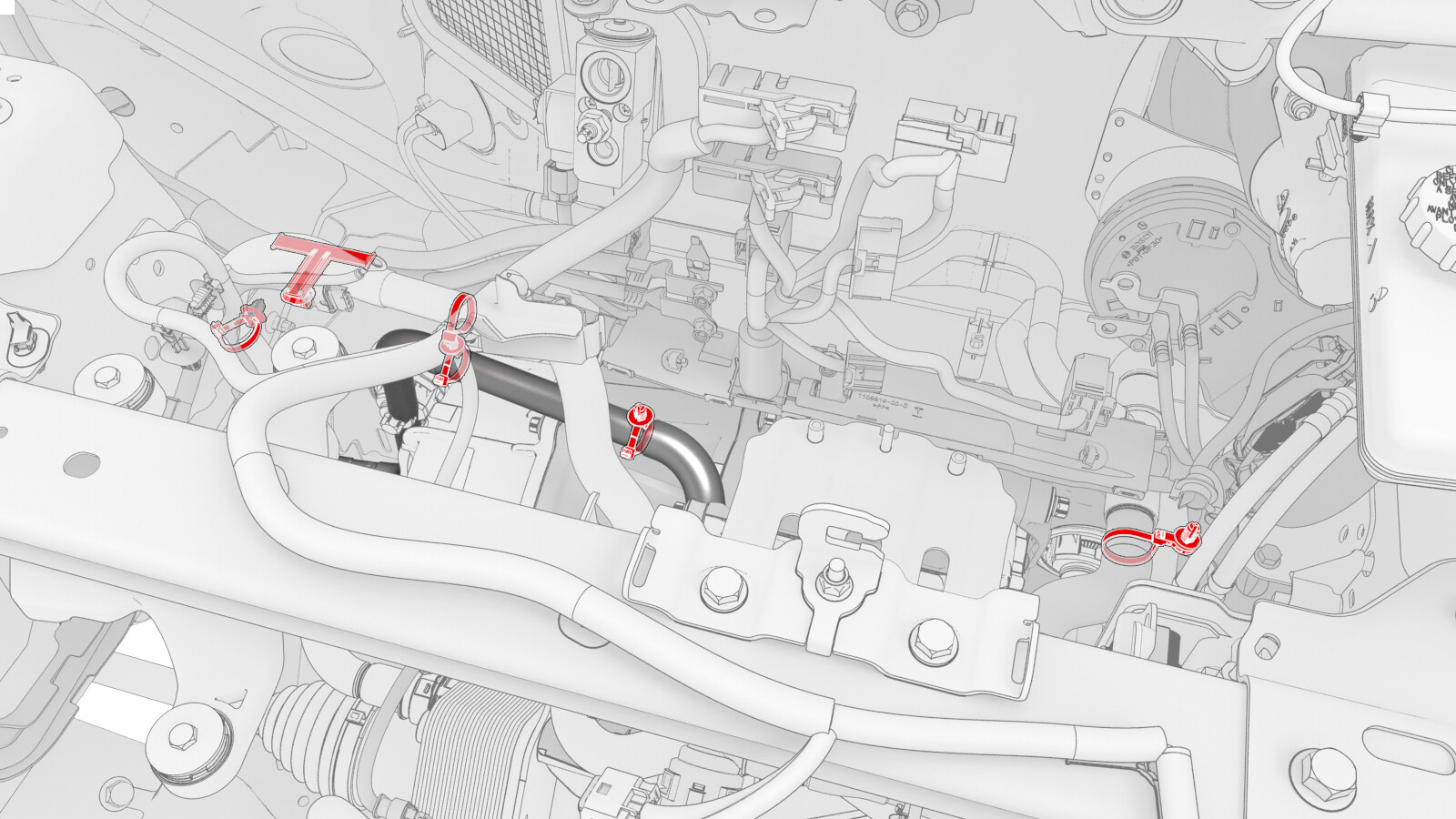 - 松开将冷却液软管和电气线束固定到 12V 电池支架横梁的夹子。