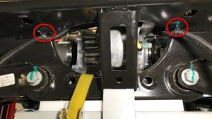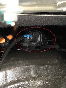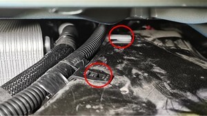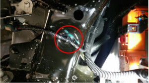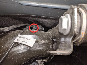 将新线束从右至左穿过副车架与后驱动单元之间的空隙,然后将线束固定在副车架上,小心不要损坏线束