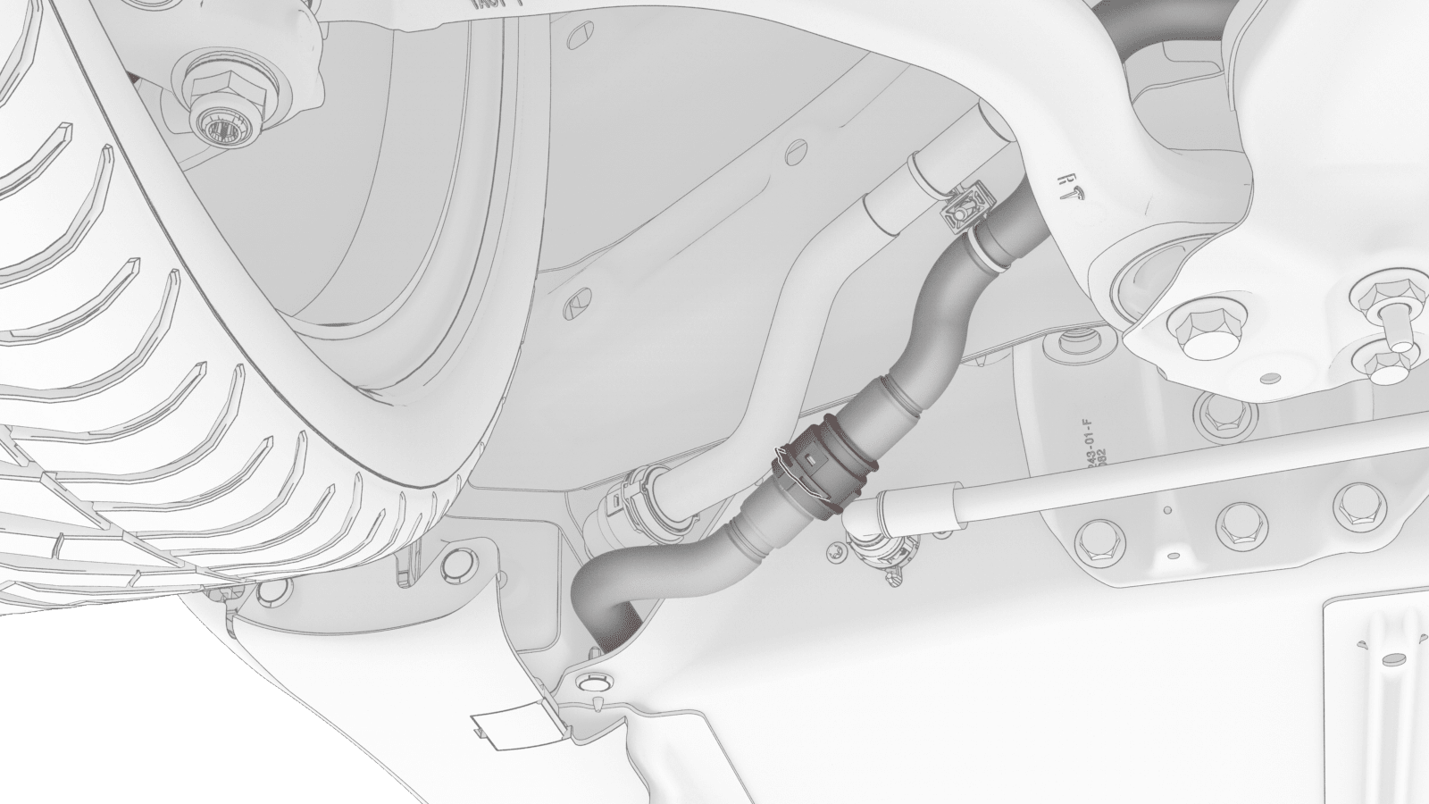 - 松开将前驱动单元逆变器入口软管固定到前驱动单元变速箱外部的夹子。