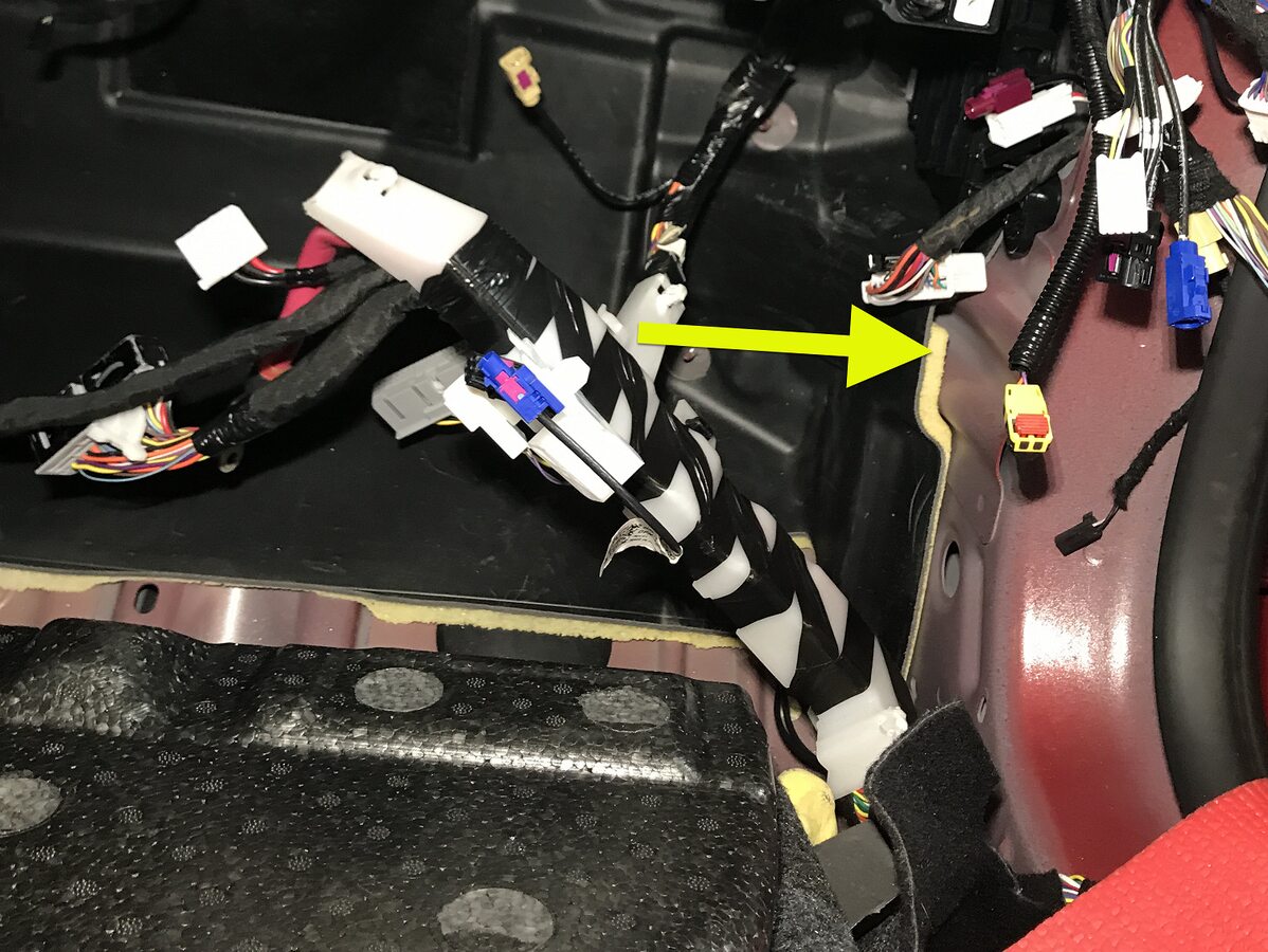 - 展开 RH 前毡毯,然后将线束重新安装到 RH 门槛处的夹子中。