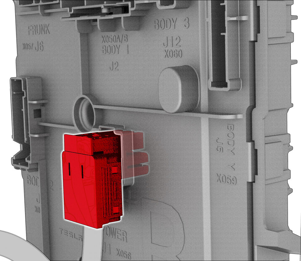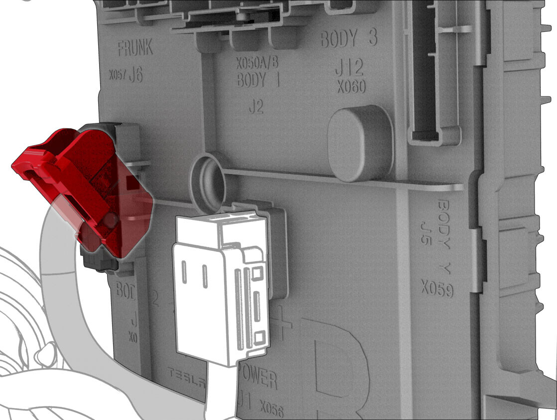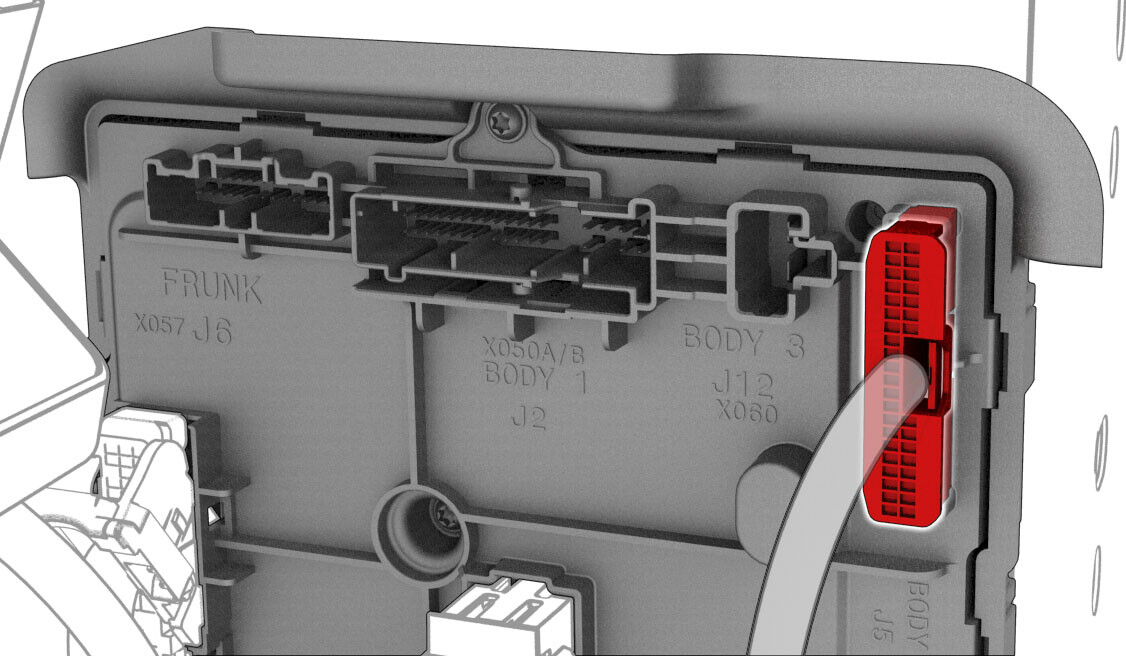 - 将 J6 前备箱储物单元电气连接器连接到右侧车身控制器模块。