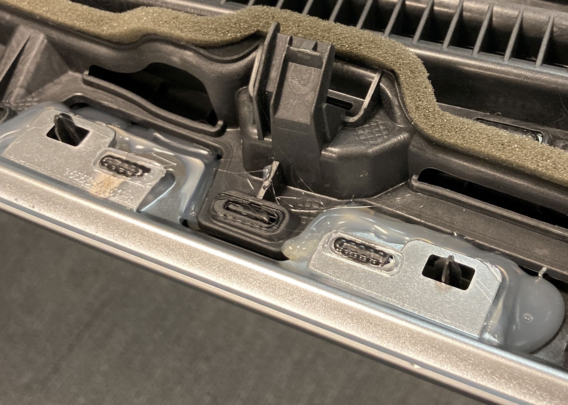 - 在铝制框架与主仪表板饰板的木制或塑料部件之间涂抹热熔胶。