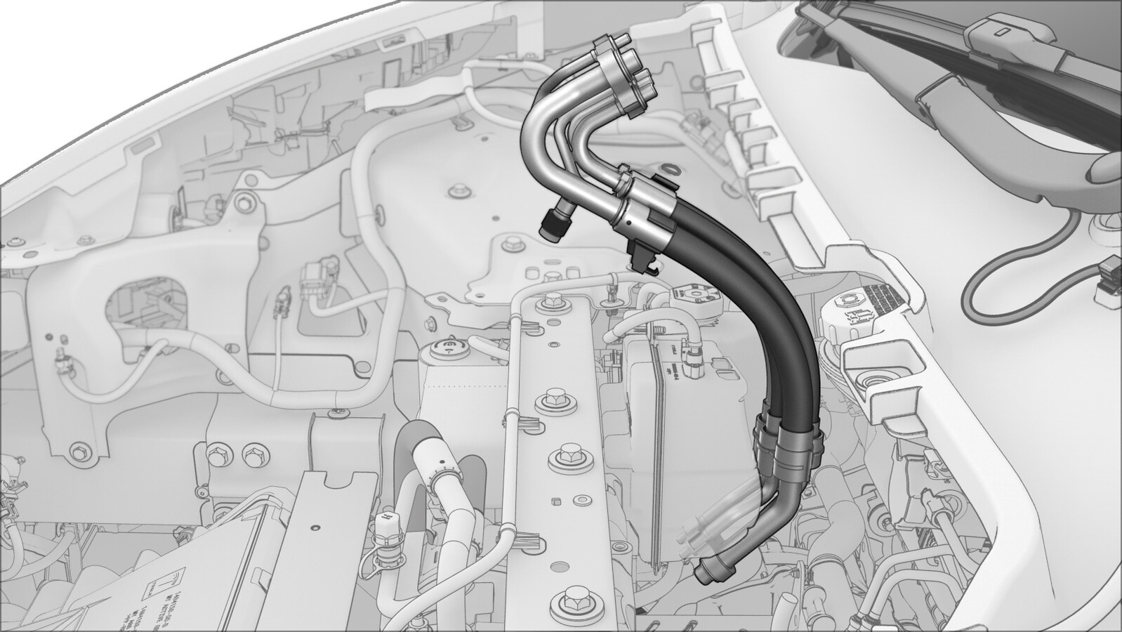 - 将超级歧管至 HVAC 空调管路从超级歧管上松开,然后将空调管路向后移动,再向上移动,以便将其拆下。