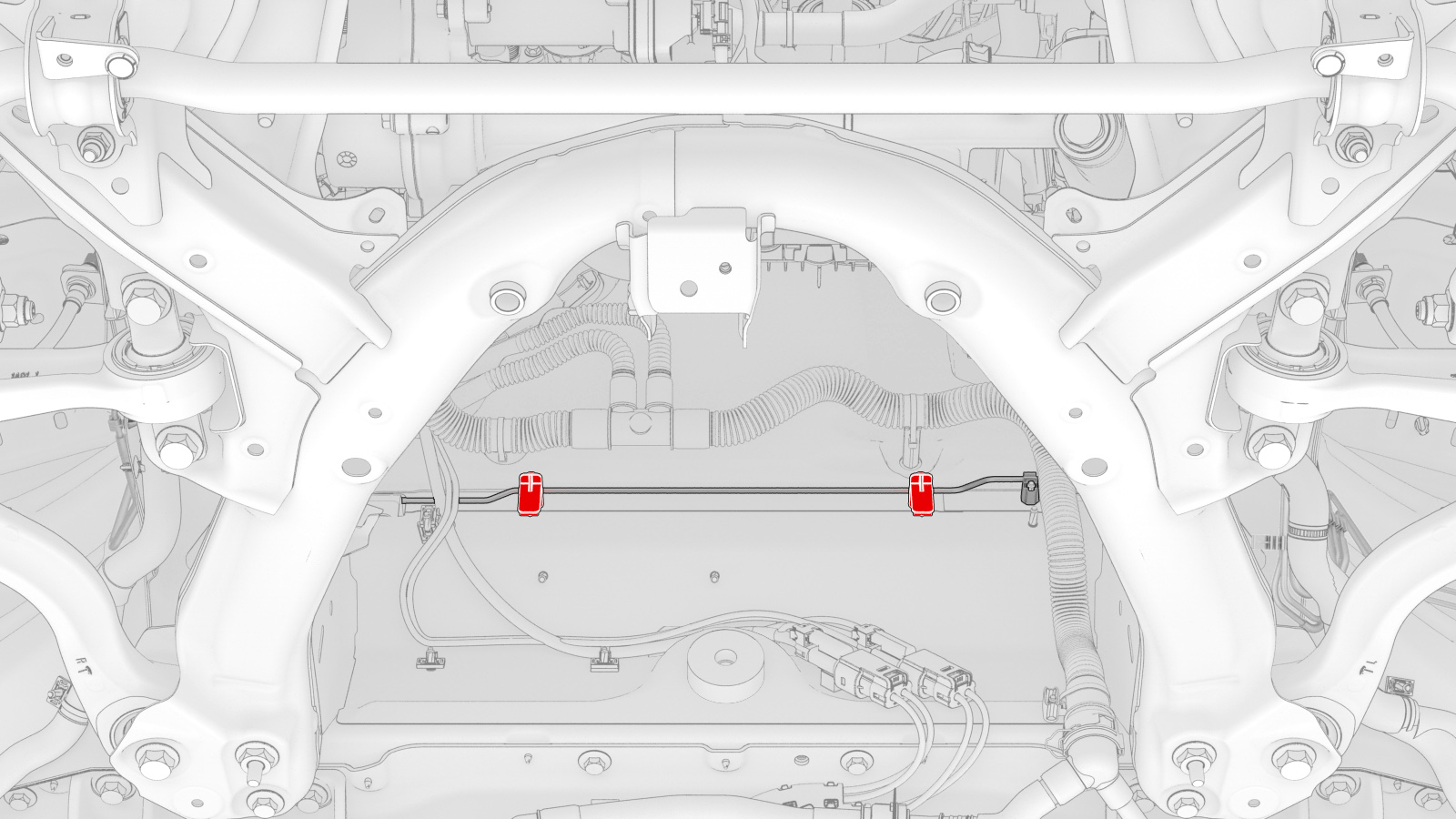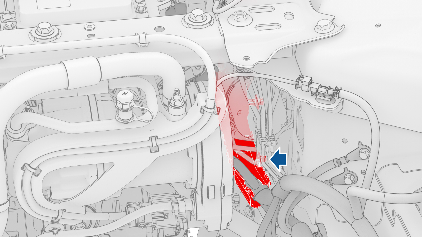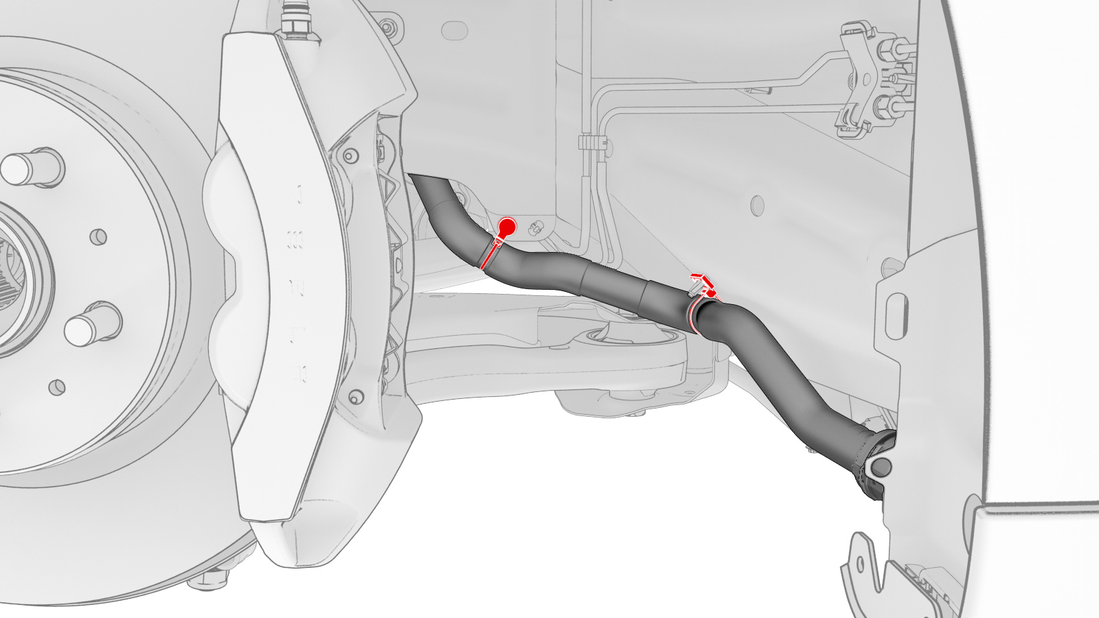 注将管路穿过 LH 轮罩移入,然后移到 RH 侧,然后向后移动。